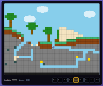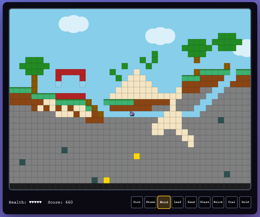 Explore randomly generated terrain filled with trees, sand pits, ores, and surprises waiting underground. Break blocks to gather resources, then place them to craft new paths, shelters, and creations limited only by your imagination. Watch sand tumble with real physics, feel the challenge of survival as you manage health, and chase a high score as you dig deeper into the world.