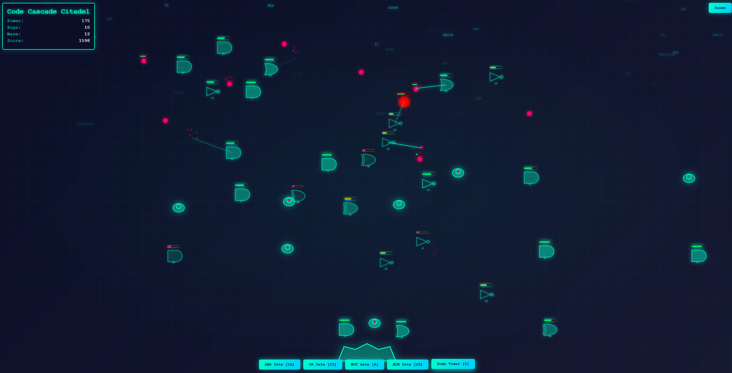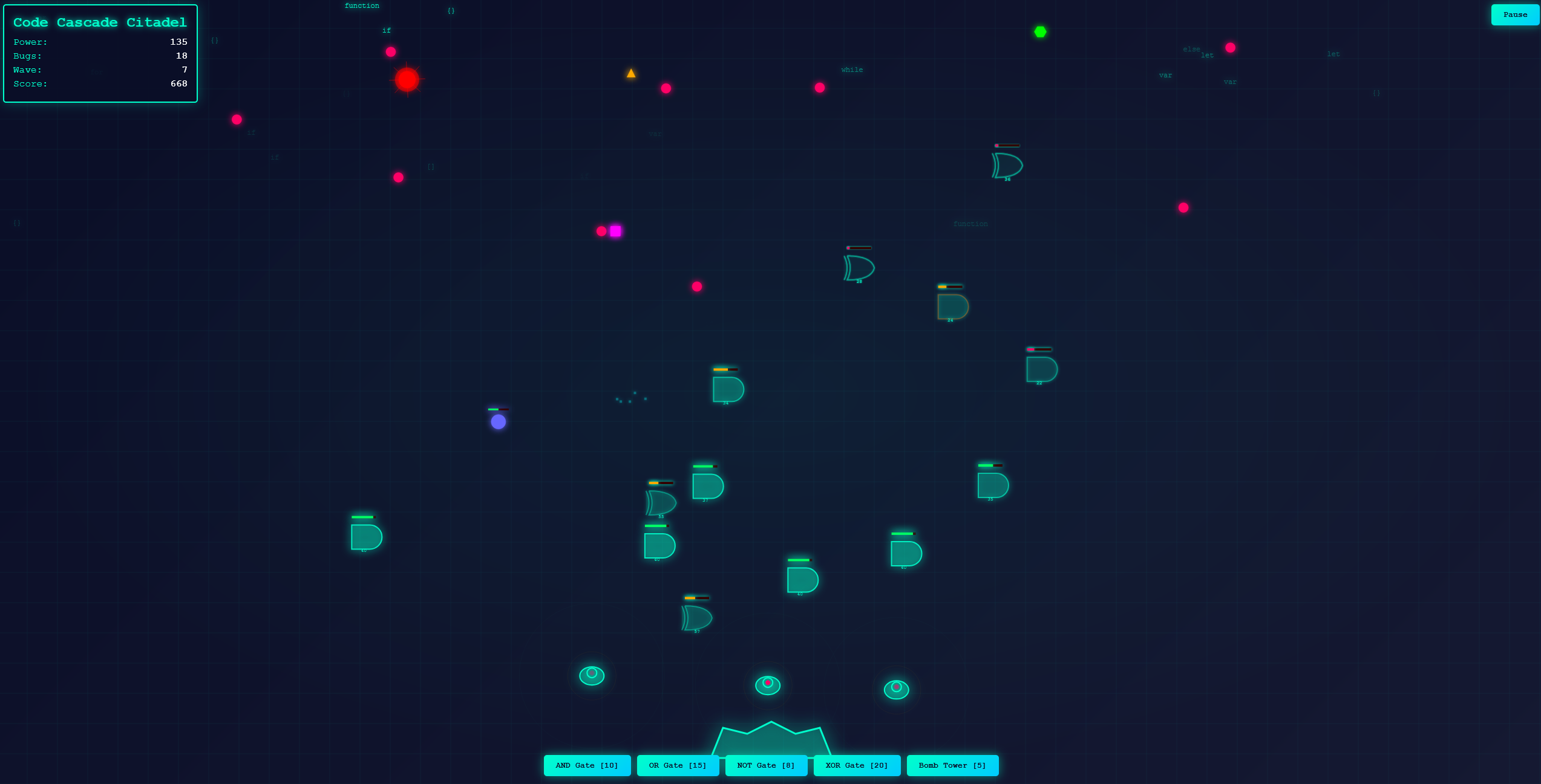 In Code Cascade Citadel, your fortress isn’t made of stone or steel—it’s built on logic itself. Waves of relentless bugs pour down through the grid, each glitching, zigzagging, or shielding their way toward the heart of your citadel. To survive, you must build, balance, and protect using the tools of pure code: AND, OR, NOT, and XOR gates, each with their own strengths and weaknesses. Every defense you place is more than a weapon—it’s a symbol of structure standing against the chaos of corruption.