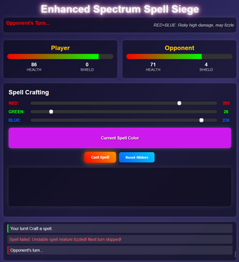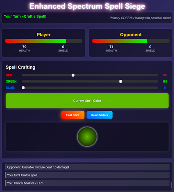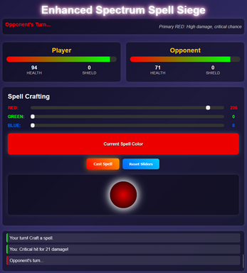 Spectrum Spell Siege is a color-fueled battle of wits where every hue holds hidden power. Craft your spells by blending red, green, and blue energy — each combination shifting the tides of war in dazzling ways. Pure crimson channels raw destruction, emerald heals and rejuvenates, while sapphire shields and stabilizes. But the real mastery lies in the mix — will your chromatic concoction unleash a devastating critical, a self-inflicted misfire, or something spectacularly unexpected? Every slider you touch determines your fate in this vibrant duel of logic and intuition.